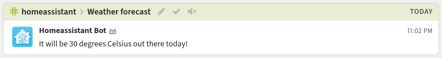 configuration.yamlfile.automation: trigger: platform: sun event: sunrise action: - service: notify.notify data: message: "It will be 30 degrees Celsius out there today!" title: "Weather forecast"The